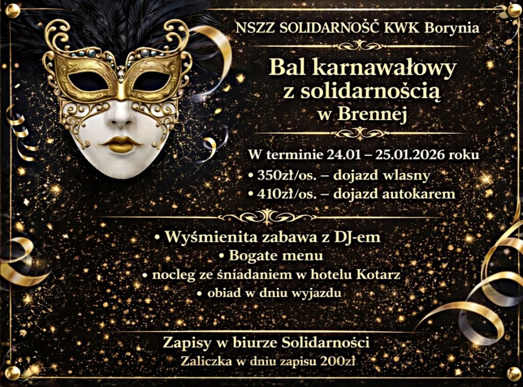 Karnawał 2026 utworzone przez Solidarność Borynia | gru 29, 2025 | Aktualności, Wycieczki Zapraszamy na zabawę karnawałową, która odbędzie się w dniach 24/25.01.2026 r. w Hotelu Kotarz w Brennej. Szczegóły oraz zapisy w siedzibie Związku.