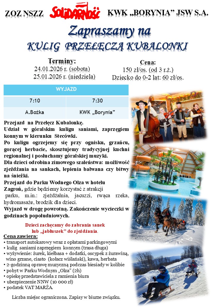 Kulig Przełęczą Kubalonki utworzone przez Solidarność Borynia | gru 8, 2025 | Aktualności, Wycieczki W dniach 24.01.2026 r. oraz 25.01.2026 r. odbędą się kuligi Przełęczą Kubalonki, na które zapraszamy członków Związku wraz z rodzinami. Szczegółowe informacje oraz zapisy w siedzibie Związku.