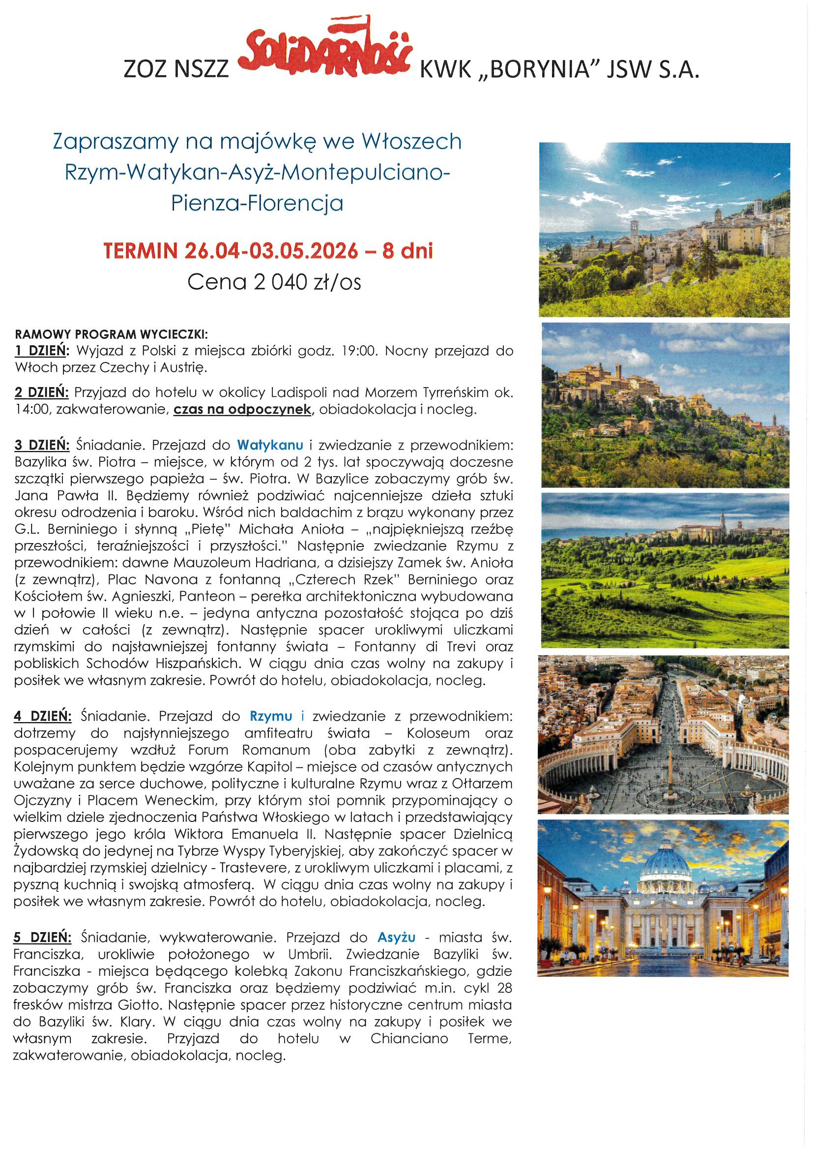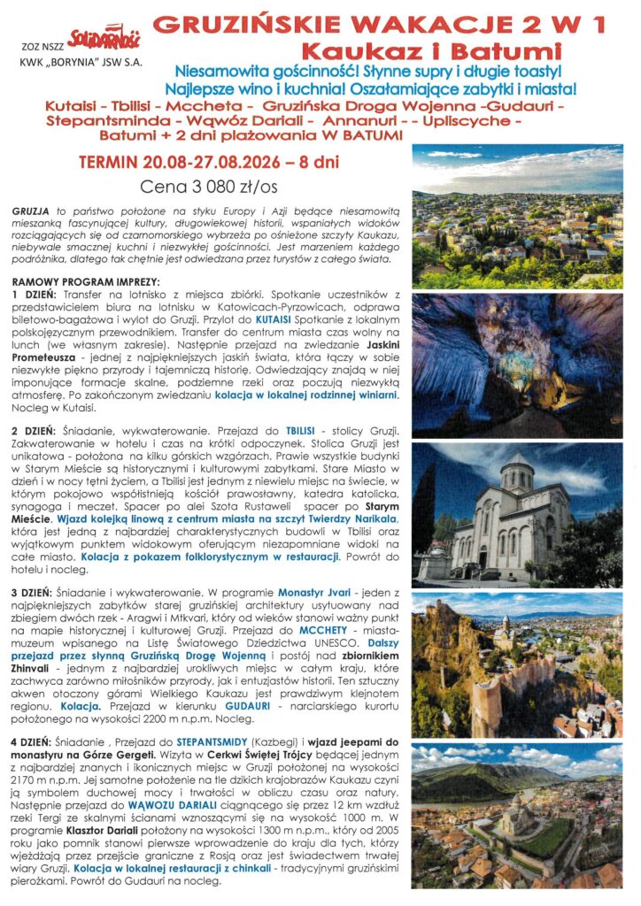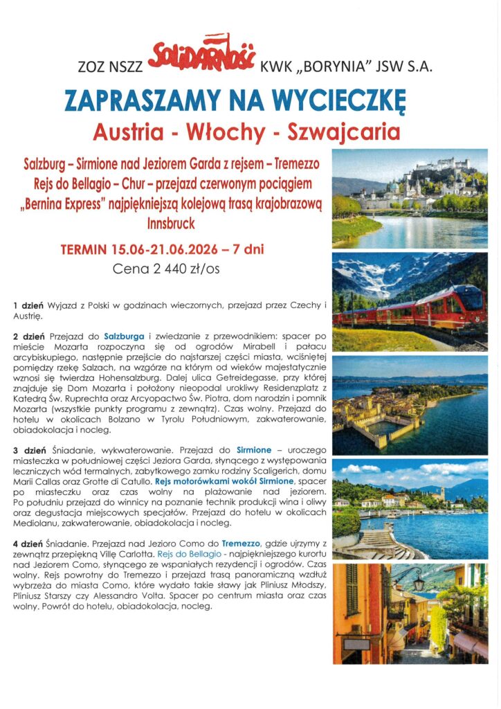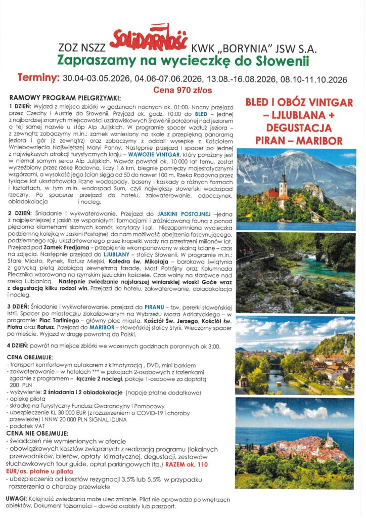 Plan wycieczek na rok 2026 utworzone przez Solidarność Borynia | paź 7, 2025 | Aktualności, Wycieczki Przedstawiamy propozycje wycieczek na rok 2026 r. Szczegóły oraz zapisy w siedzibie Związku oraz pod nr telefonu 32 756 12 38, 32 756 12 39.