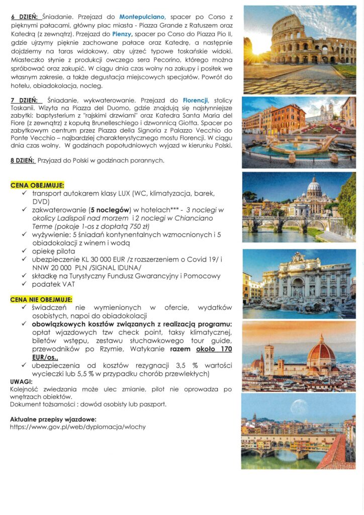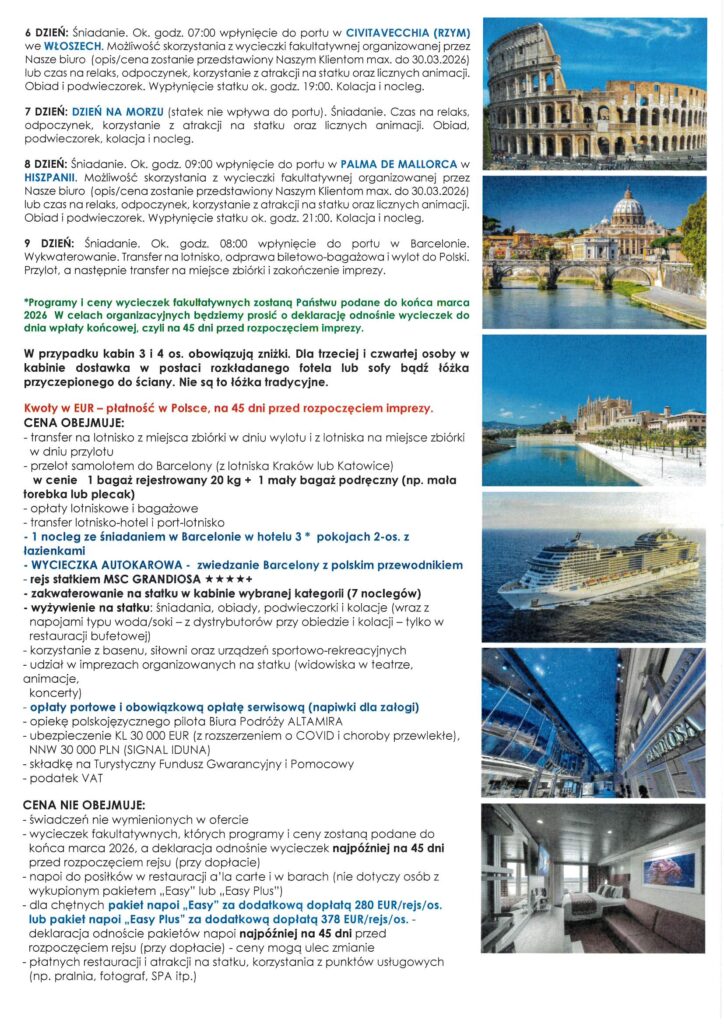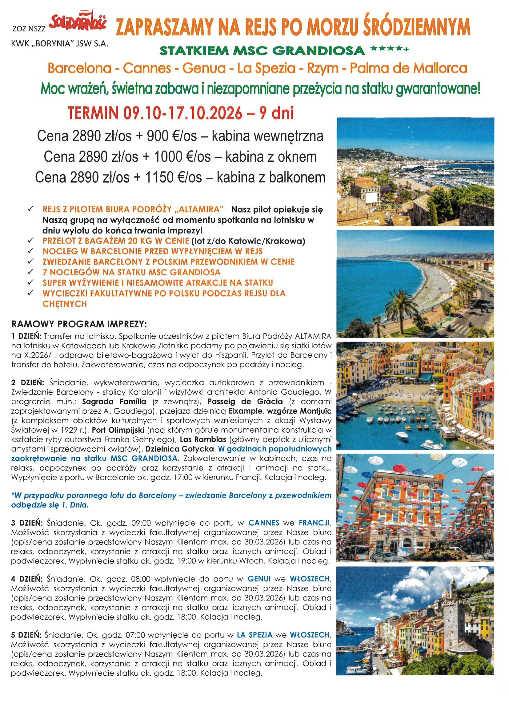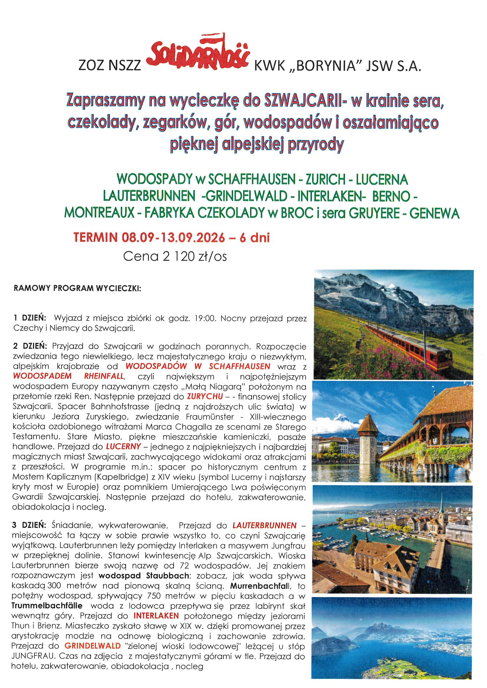 Plan wycieczek na rok 2026 utworzone przez Solidarność Borynia | paź 7, 2025 | Aktualności, Wycieczki Przedstawiamy propozycje wycieczek na rok 2026 r. Szczegóły oraz zapisy w siedzibie Związku oraz pod nr telefonu 32 756 12 38, 32 756 12 39.
