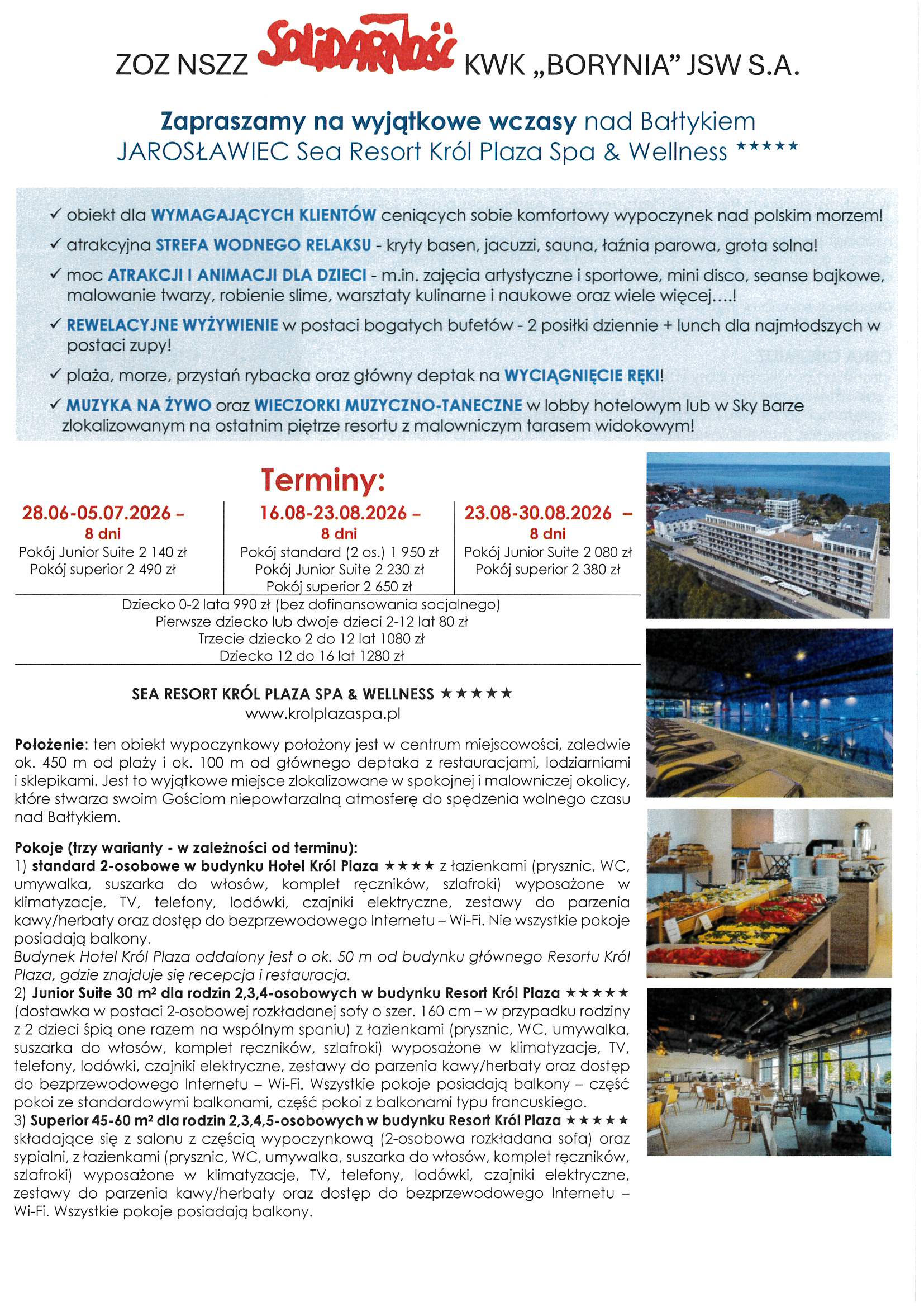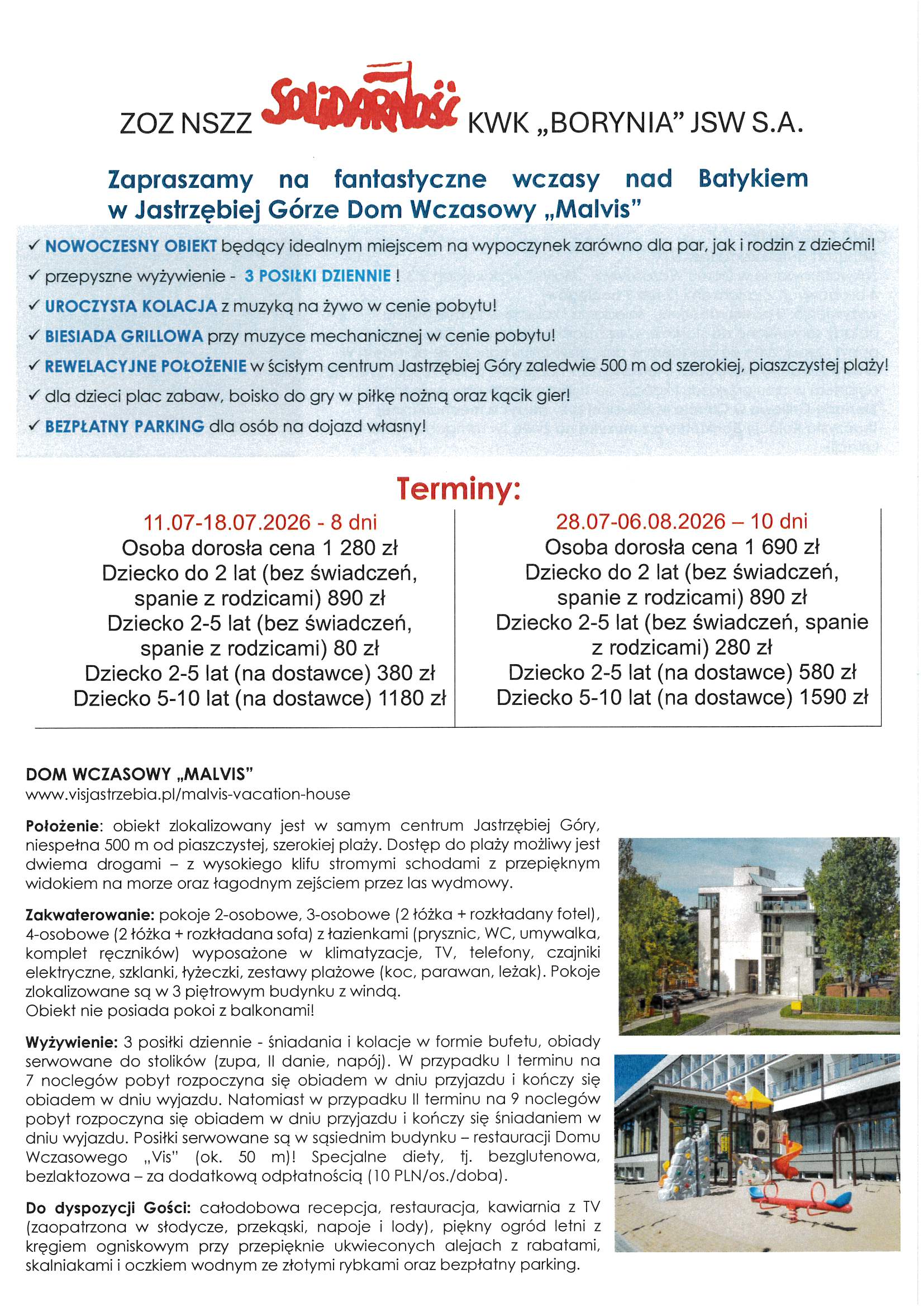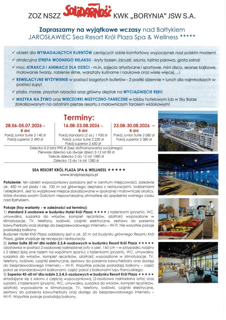 Wczasy krajowe – 2026 r. utworzone przez Solidarność Borynia | paź 7, 2025 | Aktualności, Wycieczki Przedstawiamy propozycje letniego wypoczynku na rok 2026 – wczasy krajowe. Szczegóły oraz zapisy w siedzibie Związku i pod nr telefonu 32 756 12 38, 32 756 12 39.