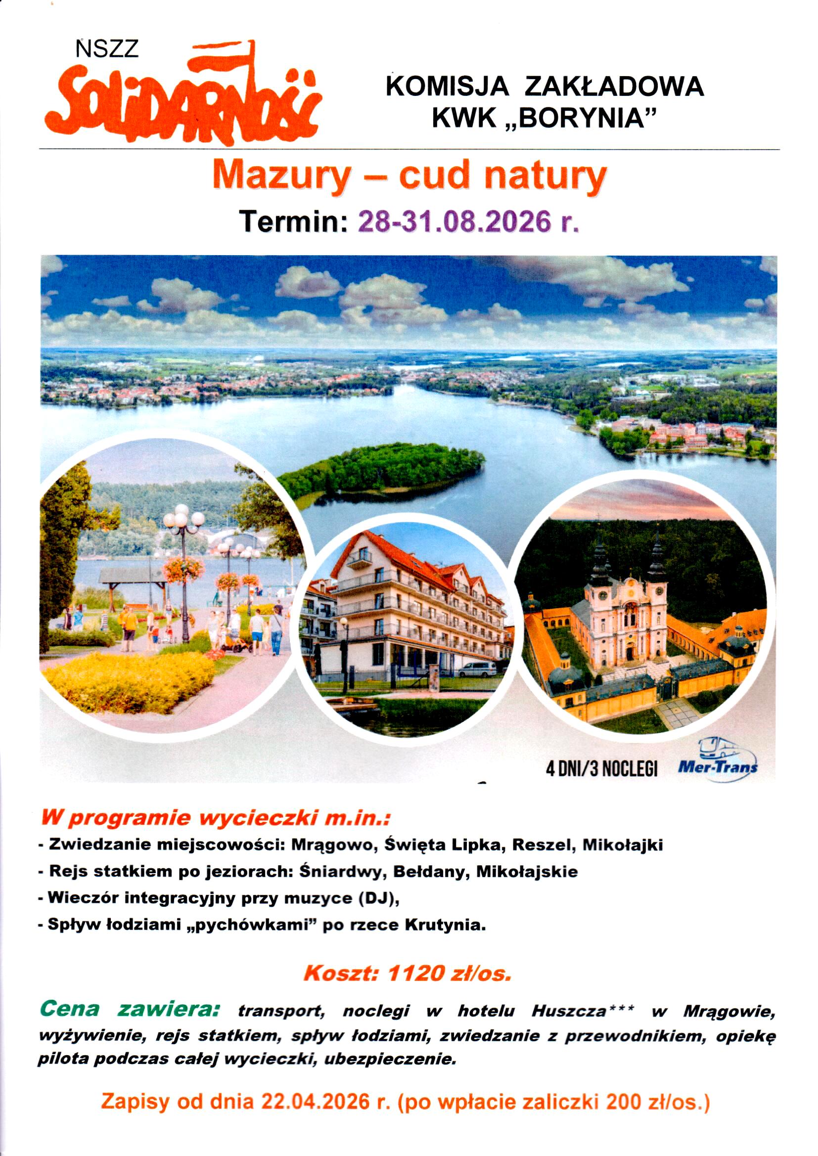 Wycieczka na Mazury dla członków Sekcji Emerytów i Rencistów utworzone przez Solidarność Borynia | kwi 1, 2026 | Aktualności, Sekcja Emerytów i Rencistów, Wycieczki Zapraszamy członków SEiR na wycieczkę „Mazury – cud natury”, która odbędzie się w terminie 28-31.08.2026 roku. Koszt uczestnictwa 1120 zł/os. Zapisy od dnia 22.04.2026 roku, po wpłacie zaliczki 200 zł/os.